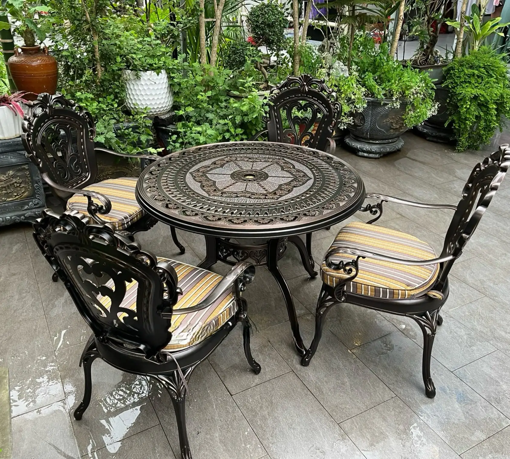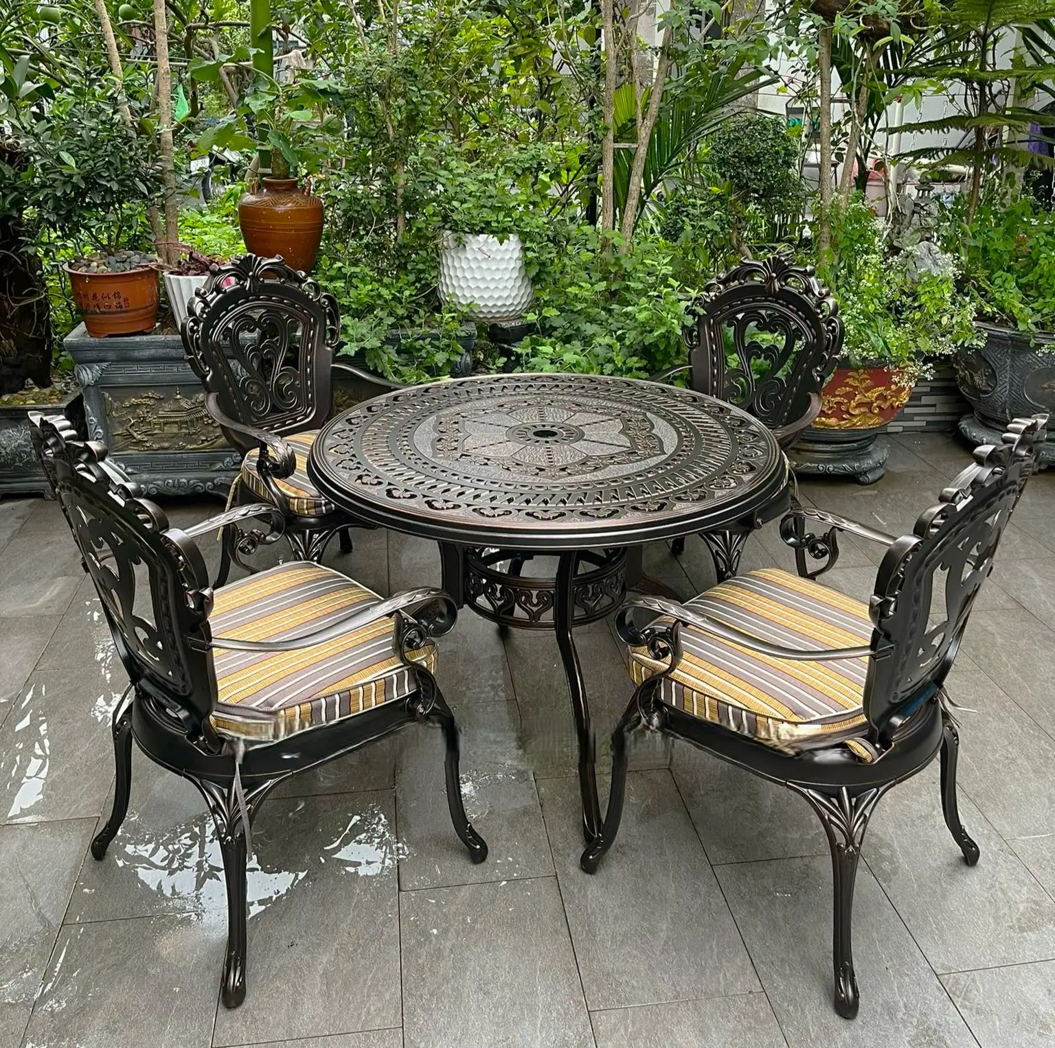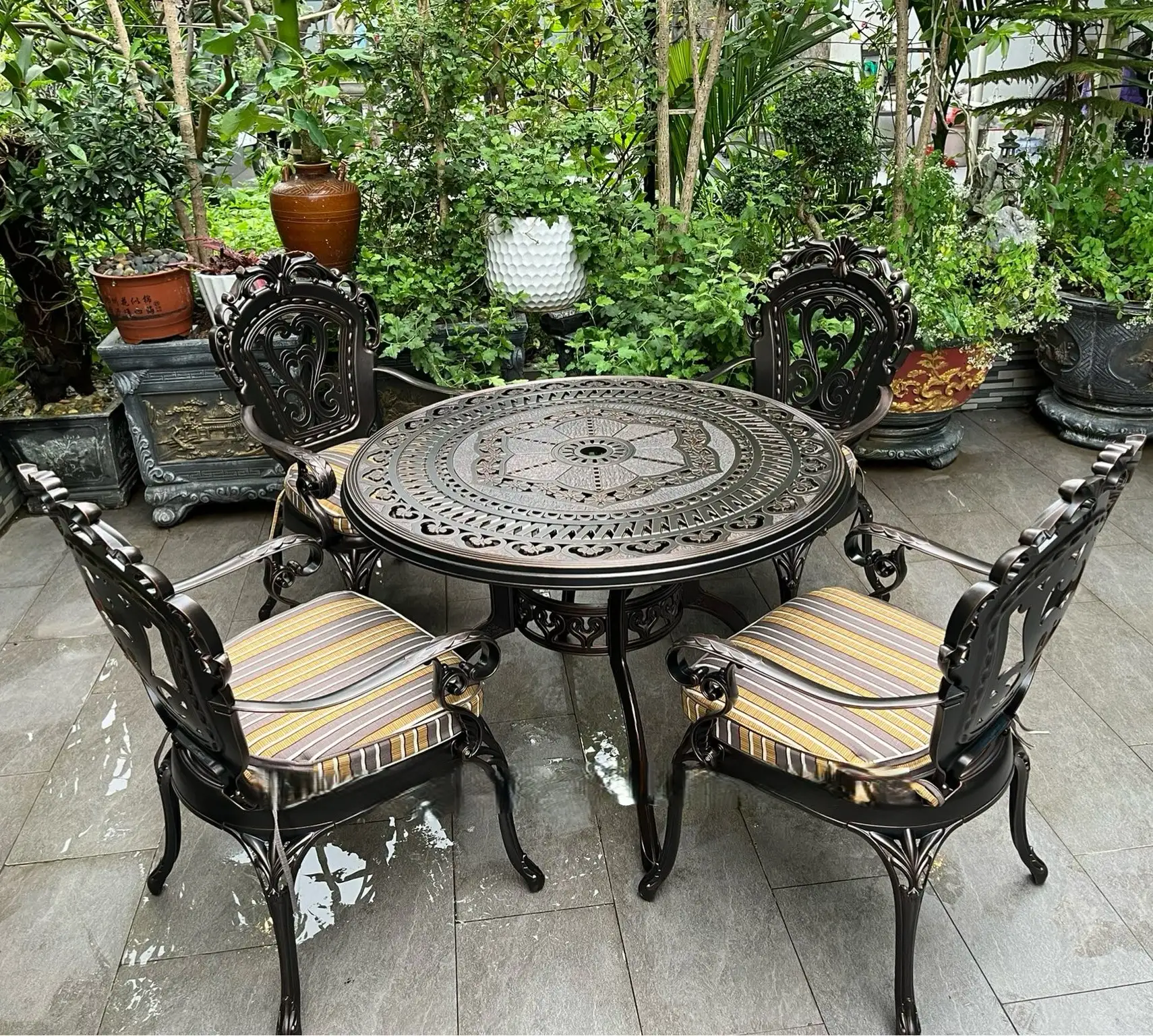 Nếu bạn đang tìm kiếm một bộ bàn ghế sân vườn vừa sang trọng, vừa bền đẹp theo năm tháng, thì Bàn Ghế Ngoài Trời Nhôm Đúc 4 Ghế Tân Cổ Điển chắc chắn sẽ làm bạn hài lòng. Với thiết kế mềm mại, hoa văn đậm chất châu Âu cổ điển và chất liệu cao cấp, sản phẩm không chỉ làm đẹp không gian mà còn thể hiện gu thẩm mỹ tinh tế của gia chủ.