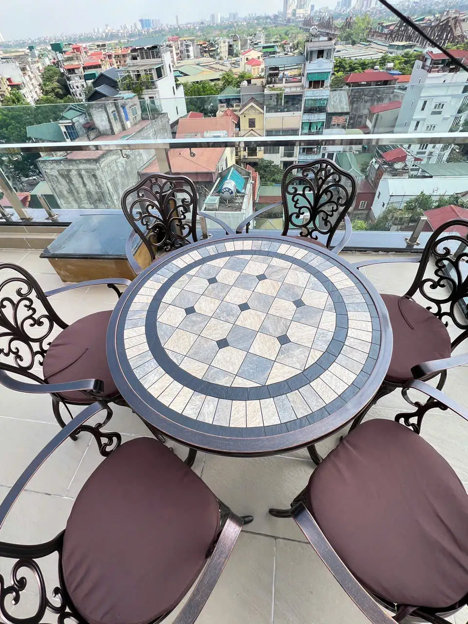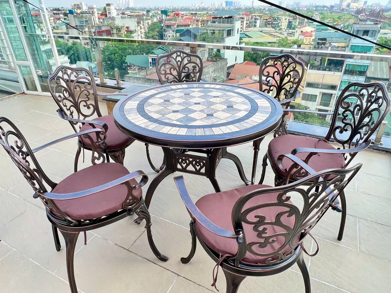 Được chế tác từ nhôm đúc phủ sơn tĩnh điện cao cấp giúp chống gỉ sét, chống ăn mòn, phù hợp với khí hậu nóng ẩm mưa nhiều của Việt Nam. Mặt bàn đá gốm cao cấp không chỉ sang trọng mà còn bền bỉ với khả năng chống trầy xước, chịu nhiệt, dễ vệ sinh – giúp bộ sản phẩm luôn giữ được vẻ mới mẻ theo thời gian.