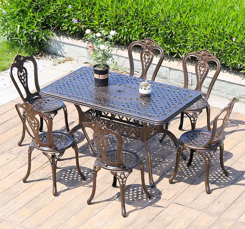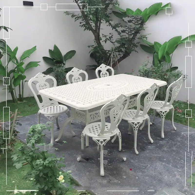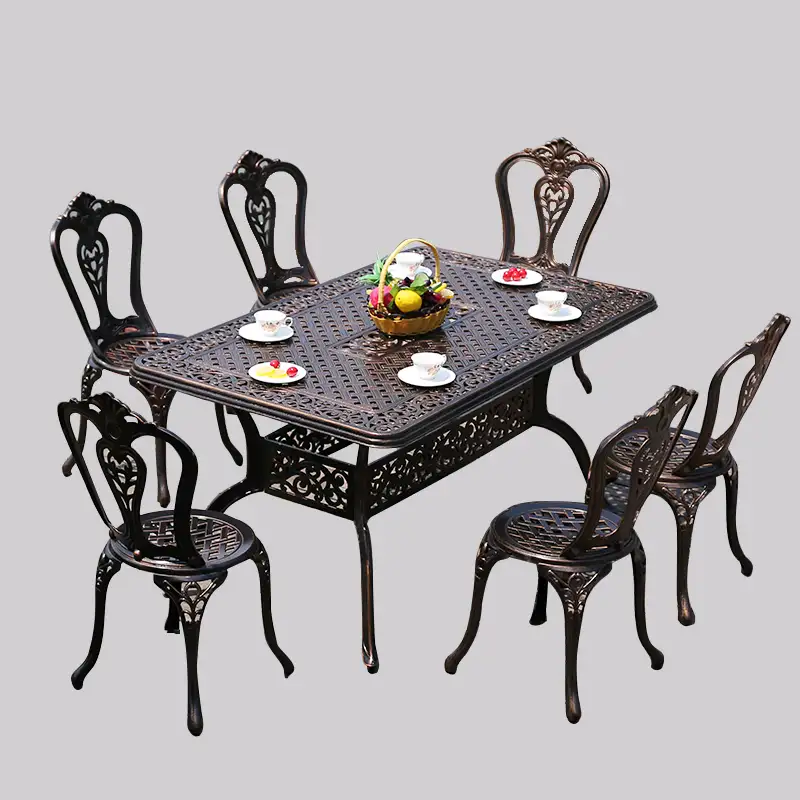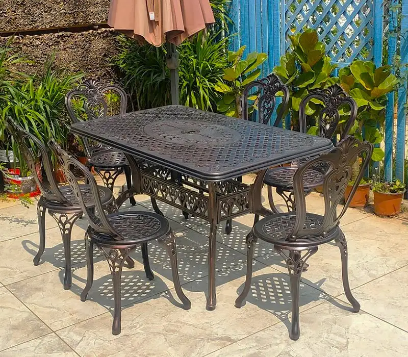 Bộ bàn ghế nhôm đúc ngoài trời gồm một bàn hình chữ nhật có kích thước 150*90*73cm và 6 ghế 45 *52*87cm cả bàn và ghế ngồi đều được thết kế mặt lỗ và các họa tiết hoa văn rất cân xứng và mềm mại để tạo nên một vẻ đẹp duyên dáng và nét sang trọng quý phái và thanh lịch. …Kiểu dáng thiết kế độc đáo, ấn tượng trong các đường nét tỉ mỉ chi tiết giúp những mẫu bàn ghế nhôm đúc luôn được thu hút người xem từ cái nhìn đầu tiên