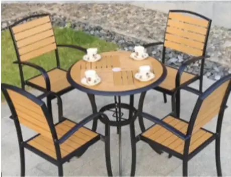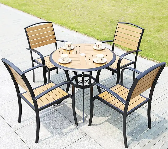 Sự kết hợp hài hòa giữa bộ khung bàn và ghế làm từ hợp kim nhôm phun sơn tĩnh điện cao cấp và nan nhựa giả gỗ Composite đã tạo nên vẻ đẹp hiện đại và sang trọng cho tổng thể của sản phẩm.