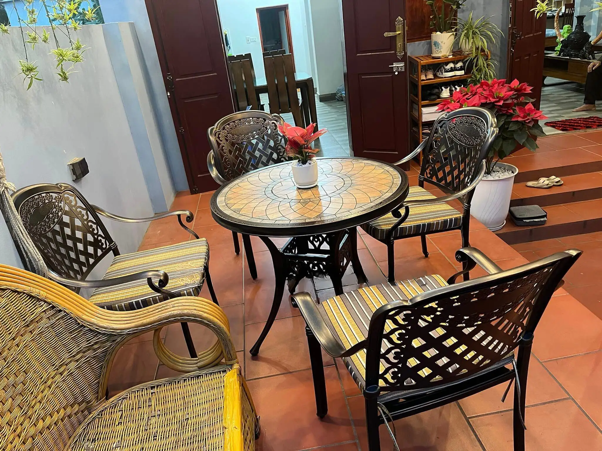 Bộ bàn sân vườn đẹp được làm bằng chất liệu nhôm đúc mặt lát gạch đá gốm cao cấp, khung bàn và ghế được phủ thêm hai lớp sơn tĩnh điện cao cấp. Chất liệu này không chỉ cứng cáp mà còn có khả năng kháng nước, kháng gỉ và hạn chế tối đa các tác động từ môi trường. Bạn có thể đặt bộ bàn ghế nhôm đúc nghệ thuật làm bàn ăn/bàn trà tại khu vực sân vườn/ban công mà không phải lo sợ thời tiết bào mòn.han gỉ hay bong tróc sơn trong quá trình sử dụng.