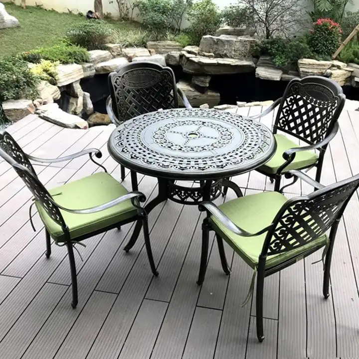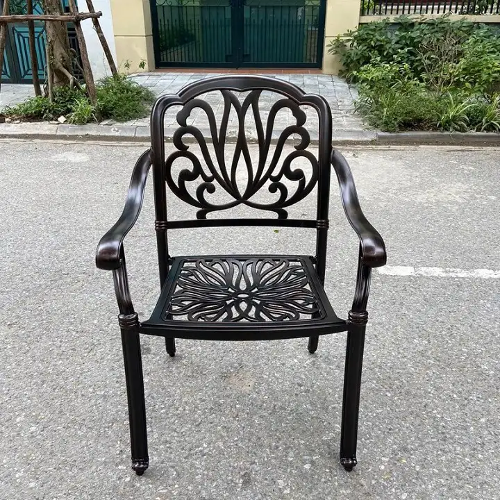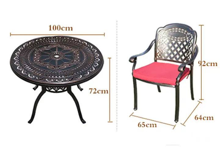 Bộ bàn ghế nhôm đúc gồm một bàn tròn có kích thước D100*H73 và 4 ghế 65*64*H92cm cả bàn và ghế ngồi đều được thết kế mặt lỗ và các họa tiết hoa văn rất cân xứng và mềm mại.