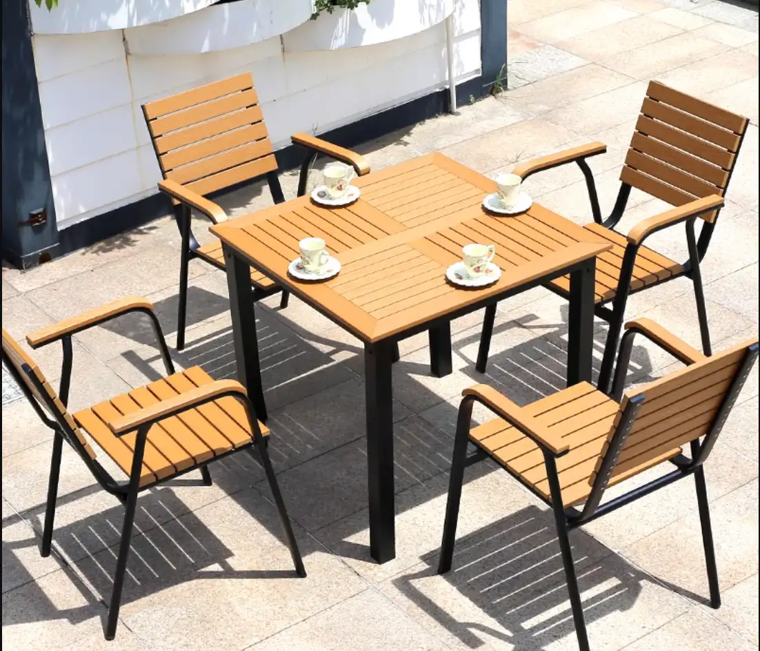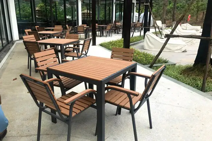 Bộ bàn ghế ngoài trời được thiết kế theo hình vuông có kích thước vừa đủ cho 4 ghế ngồi là 80*80*72cm và ghế ngồi có kích thước là 55*54*88cm có tay vịn nên người ngồi cảm thấy rất thoải mãi, toàn bộ khung bàn và ghế được sử dụng chất liệu hợp kim nhôm kết hợp vời lớp sơn tĩnh điện giúp cho sản phẩm bèn và tốt hơn, mặt bàn và ghế được làm từ nan gỗ polywood chống thấm nước một loại vật liệu được sử dụng phổ biến nhất hiện nay trong ngành ngoại thất.