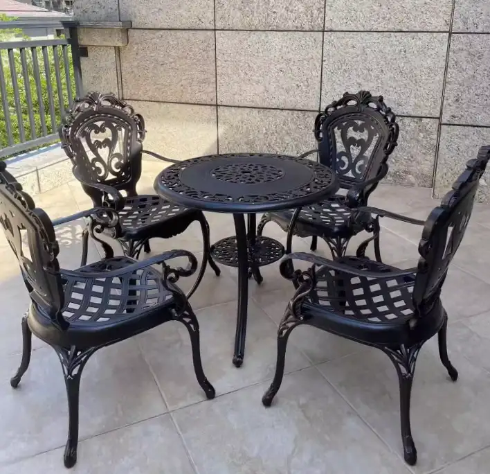 Khung bàn và ghế được làm từ hợp kim nhôm đúc sơn tĩnh điện – vật liệu chuyên dùng cho nội thất ngoài trời cao cấp. Sản phẩm hoàn toàn không bị han gỉ, chịu được nắng mưa, giữ màu bền đẹp trong suốt nhiều năm sử dụng mà không cần bảo trì phức tạp.