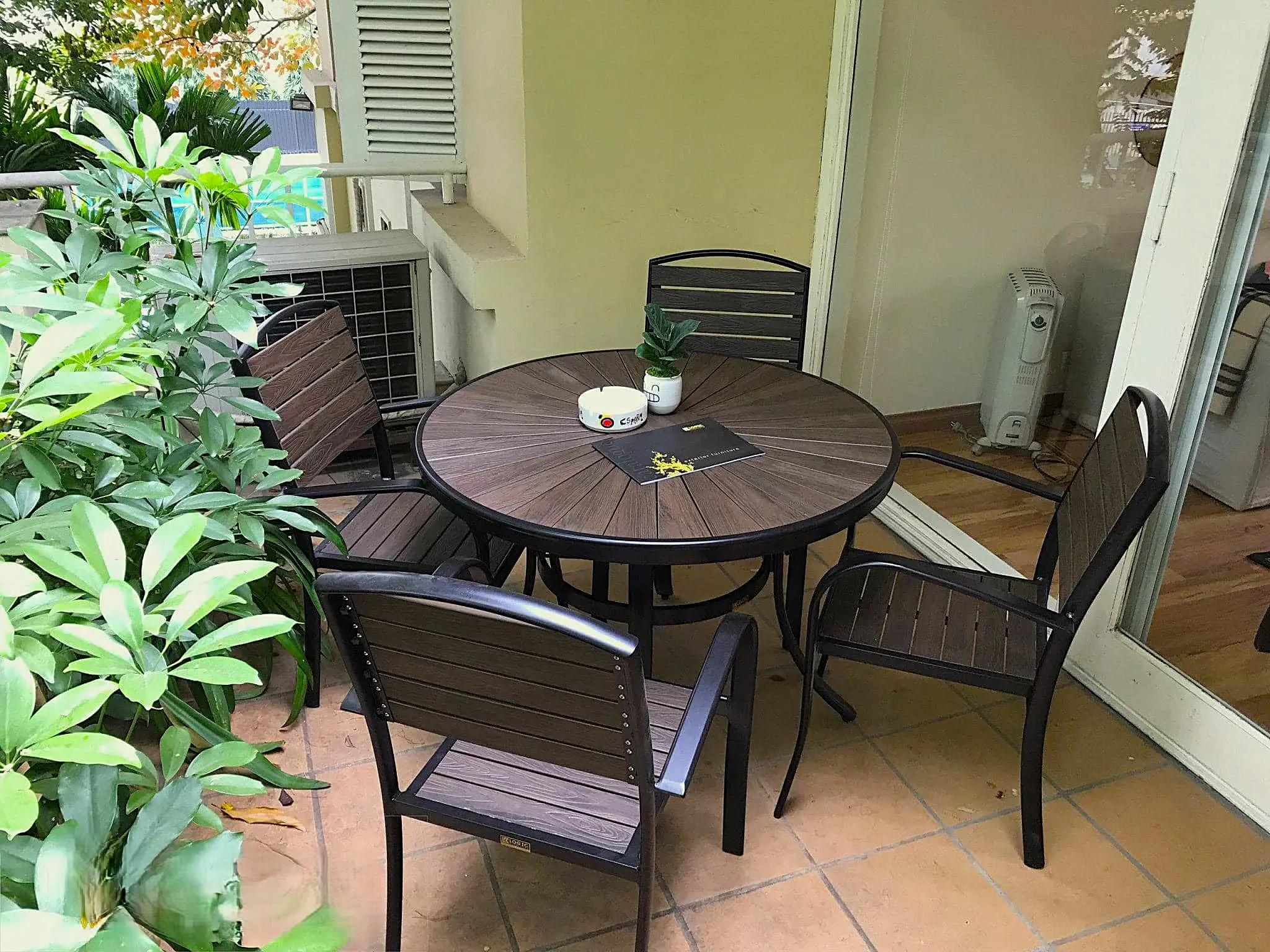Mặt bàn được thiết kế từ nan gỗ nhựa composite – loại chất liệu chuyên dụng cho không gian ngoài trời. Với khả năng chống chịu nắng mưa mà không bị han gỉ, gãy mục như nhiều chất liệu khác, gỗ nhựa composite đảm bảo cho sản phẩm sự bền bỉ và tuổi thọ cao. Ngoài ra, công nghệ sơn tĩnh điện cao cấp giúp tạo nên lớp phủ sáng bóng, bền màu, và có khả năng chống oxy hóa, ngăn chặn bong tróc trong quá trình sử dụng.