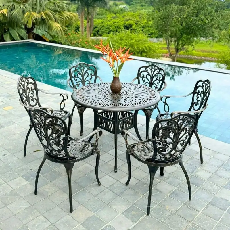 Bộ bàn ghế được làm từ chất liệu nhôm đúc cao cấp, kết hợp với lớp sơn tĩnh điện hiện đại. Điều này không chỉ mang lại độ bền cao, mà còn giúp sản phẩm duy trì vẻ đẹp theo thời gian. Với khả năng chống oxy hóa và chịu đựng thời tiết khắc nghiệt, bộ bàn ghế này có tuổi thọ lên đến 10 năm sử dụng. Sơn tĩnh điện có độ bám dính tốt, giảm thiểu tối đa tình trạng trầy xước và bong tróc, giúp sản phẩm luôn mới mẻ và bắt mắt.